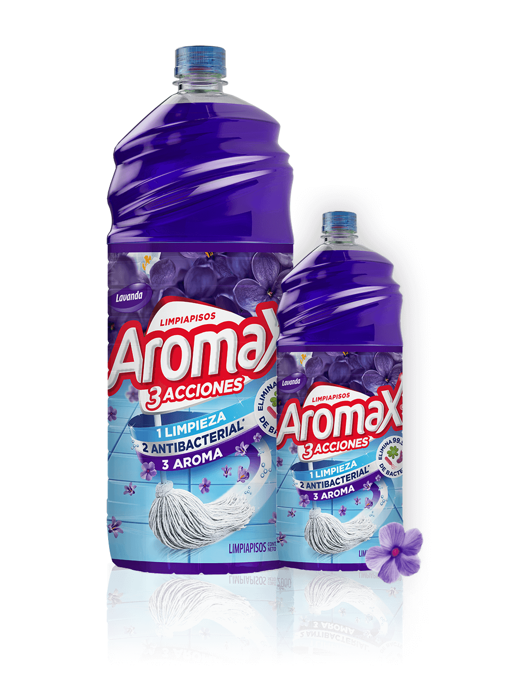 Nuevo Aromax líquido 3 acciones: 1. Aroma delicioso que dura por horas, 2. Poder desinfectante y 3. Limpieza profunda